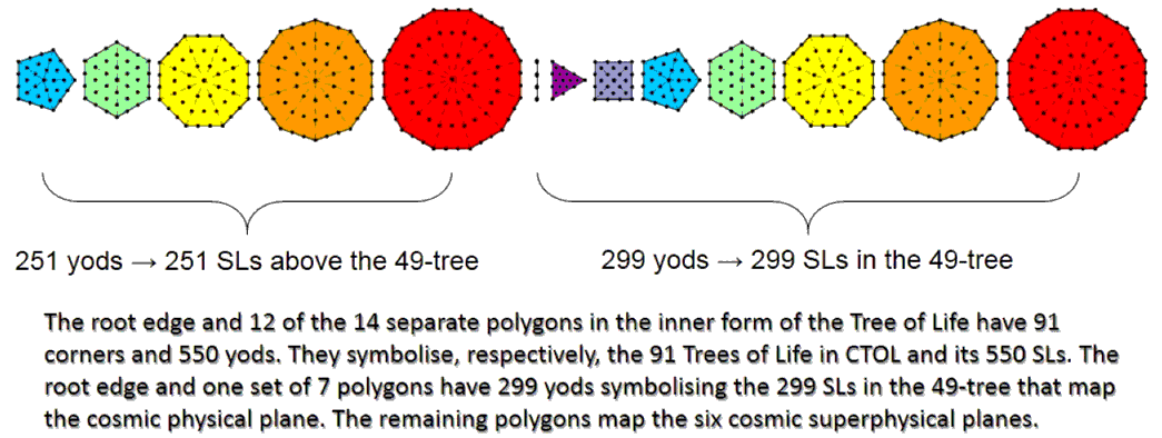 This is also the number of SLs up to Chesed of the 49th Tree of Life in CTOL. In other words, this number measures the number of SLs in CTOL up to the first Sephirah of Construction of the Tree of Life that maps the highest of the 49 subplanes of the cosmic physical plane and which represents the same Sephirah, the first subplane of the Adi plane corresponding to Chesed. The seven centres of the polygons, or the seven corners of the heptagon, are the counterpart of the lowest seven SLs of the 1-tree and the 288 remaining yods in either case are the counterpart of the next 288 SLs up to Chesed of the 49th Tree, where