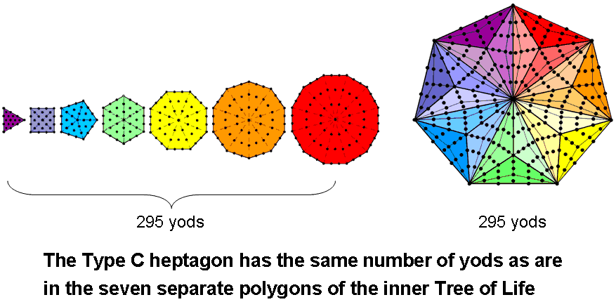 The number of yods in the Type C n-gon = 42n + 1. The Type C heptagon (n=7) has 295 yods. This is the number of yods in the seven separate Type A polygons of the inner Tree of Life: