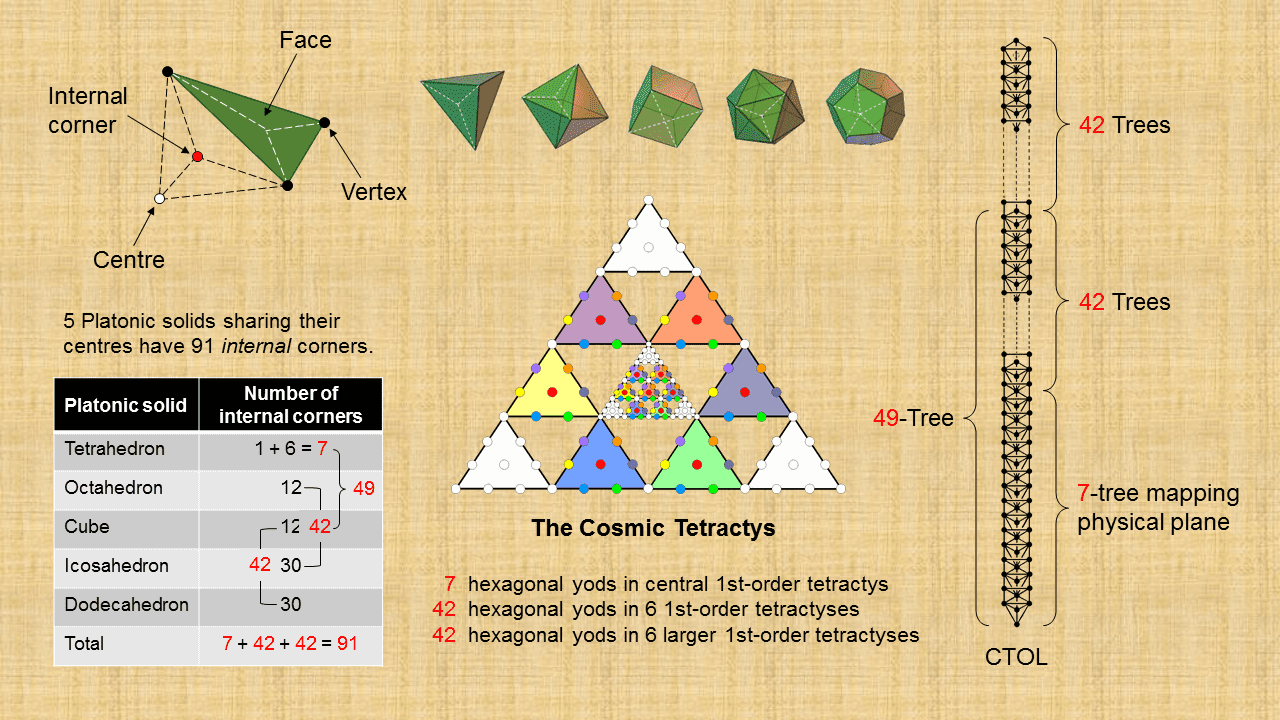 The interiors of the five Platonic solids sharing the same centre have 91 corners that correspond to the 91 Trees in CTOL. The tetrahedron has six edges that are sides of six internal Type A triangles. Their 18 sectors have seven corners. Inside the remaining four Platonic solids are 252 sectors with (91−7=84) corners. This 7:84 division in the 91 corners corresponds to the 7-tree mapping the physical plane and to the 84 Trees above it in CTOL. It also corresponds to the 84 coloured hexagonal yods in the Cosmic Tetractys that are outside the seven coloured hexagonal yods in its central tetractys. The octahedron and the icosahedron have 126 sectors of 42 internal Type A triangles with 42 corners other than their centres. Likewise, the cube and the dodecahedron have 42 corners in their interiors other than centres. One set of 42 corners corresponds to the 42 Trees of Life above the 7-tree in the 49-tree mapping the cosmic physical plane and to the 42 coloured hexagonal yods in the six smaller 1st-order tetractys in the Cosmic Tetractys; the other set of 42 corners corresponds to the 42 Trees above the 49-tree and to the 42 coloured hexagonal yods in the six larger 1st-order tetractyses in the Cosmic Tetractys. Remarkably, we see that the tetrahedron corresponds to the 7-tree mapping the physical plane, the octahedron & icosahedron correspond to the 42 Trees mapping the six superphysical planes and the cube & dodecahedron corresponds to the next 42 Trees mapping the six cosmic superphysical planes. There are three other possible combinations. However, the combination scheme just discussed seems the correct one, intuitively speaking, as the cube & dodecahedron have more external corners than the three other pairs of Platonic solids with 42 internal corners, a property that makes their correspondence with the cosmic superphysical planes more appropriate than these others pairs. The essential point that needs to be made here is the amazing fact that, constructed from Type A triangles, the five Platonic solids embody the same 7:42:42 pattern that exists for the physical plane with seven subplanes, the six superphysical planes with 42 subplanes and the six cosmic superphysical planes with 42 subplanes. This pattern must exist in the set of Platonic solids, the Cosmic Tetractys and CTOL because, being holistic systems, they must display analogous structural parameters.