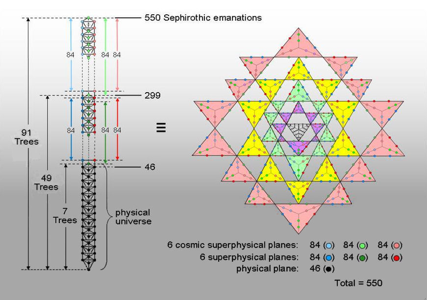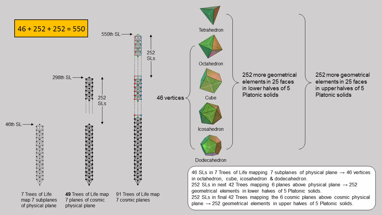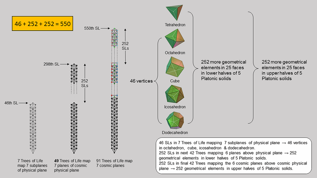 The picture above shows how the 550 geometrical elements correspond to the 550 SLs in CTOL. Seven overlapping Trees of Life have 46 SLs. This is also the number of SLs below the top of the seventh Tree of Life in CTOL. They correspond to the 46 vertices of all the Platonic solids except the tetrahedron. The remaining 504 geometrical elements comprise 252 more elements in the lower halves of the five Platonic solids and 252 elements in their upper halves. The former correspond to the 252 SLs in the next 42 Trees up to the top (298th SL) of the highest Tree in 49 overlapping Trees of Life; counting the top of the 7-tree, there are 252 SLs up to the top of the 49-tree. The latter correspond to the 252 SLs in the next 42 Trees up to the top (550th SL) of the 91st Tree. The upper halves (excluding vertices) correspond to the six cosmic superphysical planes with 42 subplanes mapped by 42 Trees, whilst the lower halves (again, excluding vertices) correspond to the six superphysical planes with 42 subplanes mapped by 42 Trees. The 46 vertices correspond to the 46 SLs of seven Trees mapping the physical plane. As will be revealed in the discussion of the Sri Yantra in the next section, this 46:252:252 division exists as well in the representation of the seven cosmic planes/CTOL by the Sri Yantra.